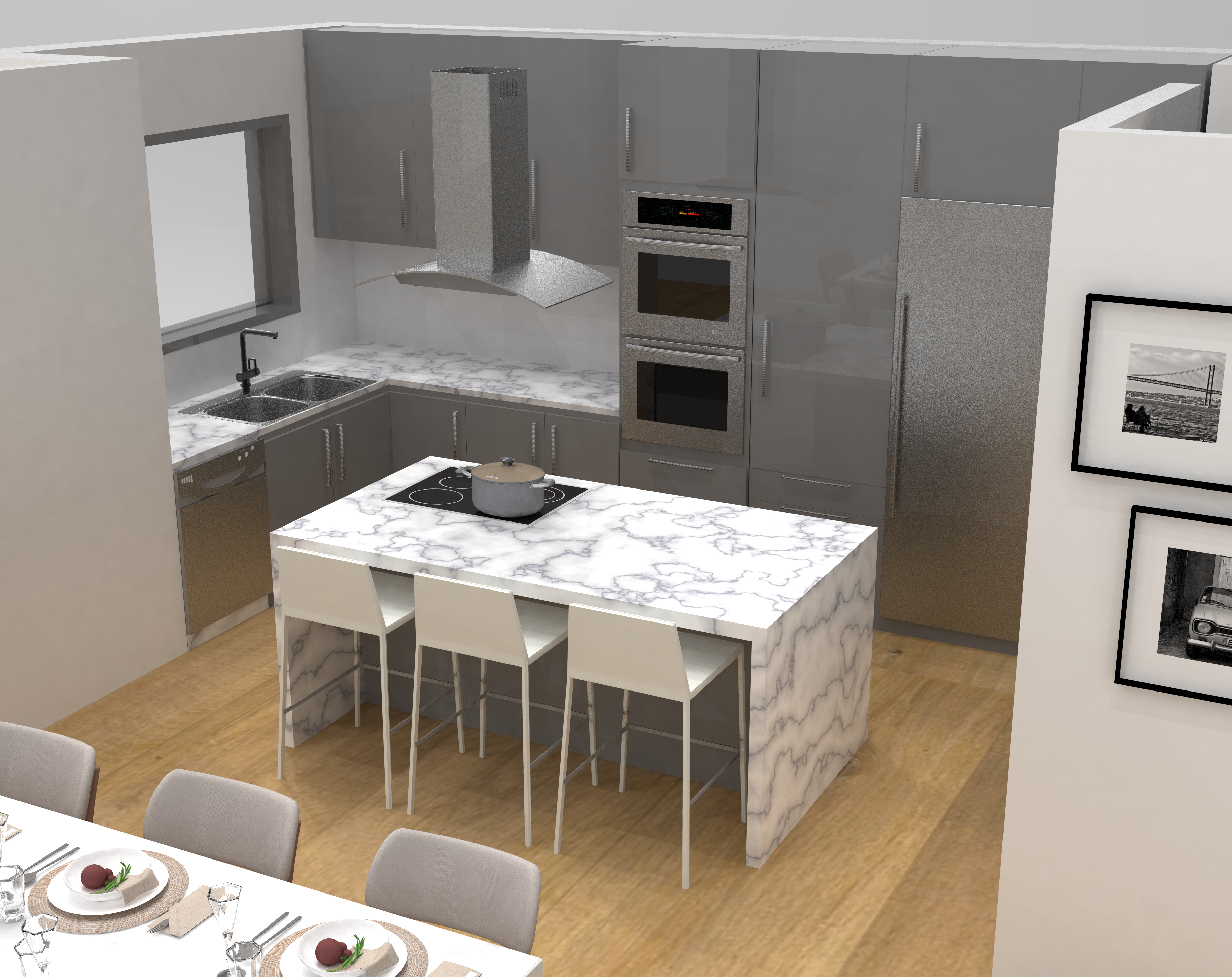 Projetamos cozinhas adaptadas ao espaço em que se inserem, em função das necessidades de trabalho, arrumação e organização, sem descurar a qualidade dos materiais e o conforto do espaço.